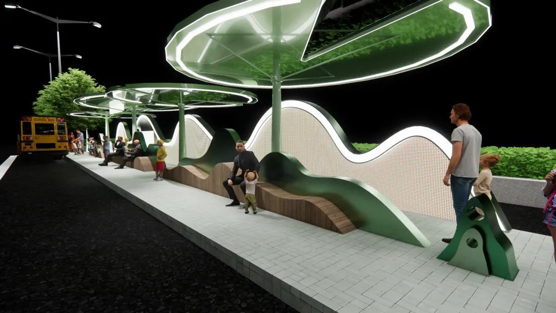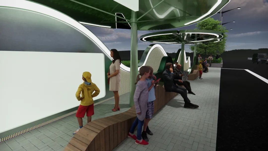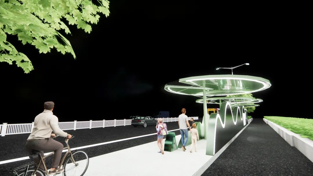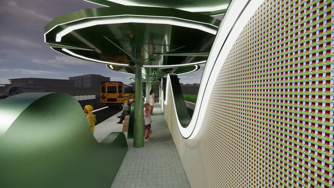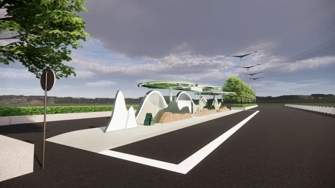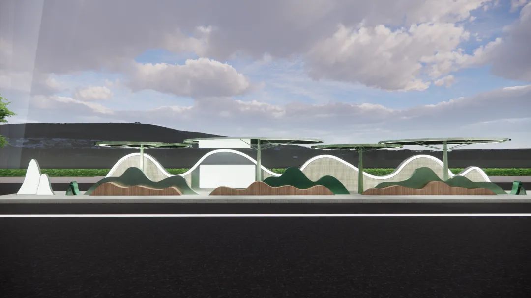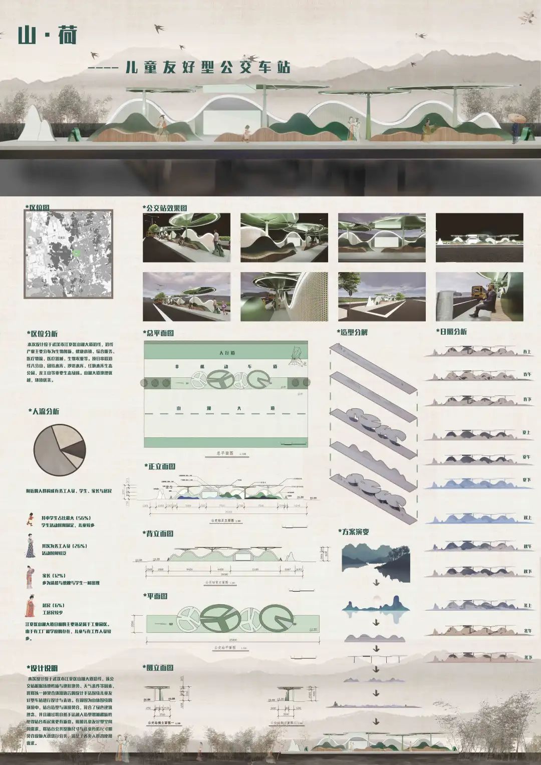 “在我的创作理念中,始终放在第一位的是便是“儿童友好型”的理念体现。我认为儿童友好型空间应当满足“趣味性”、“安全性”、“实用性”这三个原则。所以在公共设施的尺寸设计上,我始终以儿童作为主要服务采访之余,马祥展同学也分享了团队在创作过程中典型或者特别的创作小故事:”当初在构思设计草图时,我因考虑到江夏区藏龙岛有一道古钱币模样的地标性大门。于是我将公交站牌的造型设计成一枚立在地面的“古钱币”。易老师看到我的这枚钱币站牌后,认为钱币模样的设计与站台整体的造型不符合,与站台所表达的文化精神也有所出入,便提出了修改性的建议。我根据易老师的建议作出修改,将站牌设计为两座重叠的“山”造型,一高一低,“高山”为成人尺寸站牌,“低山”为儿童尺寸站牌。这样一来既符合了“儿童友好型”的设计理念,又表现出了江夏的文化风采。”对象进行设计。无论是座椅、站牌或是卫生设施,都有与儿童所相符的尺寸设计,同时这些公共设施上也有能满足成人的使用需求的尺寸设计。其次在造型设计上,我以儿童所需的“趣味性”为主,将江夏区的文化符号“山水”体现在其中。站台的整体造型不仅满足了儿童友好的要求,还体现了江夏的地方文化。在整个设计过程中,“绿色环保”理念也贯穿在其中,如建造材料的使用、卫生设施的垃圾分类等。”