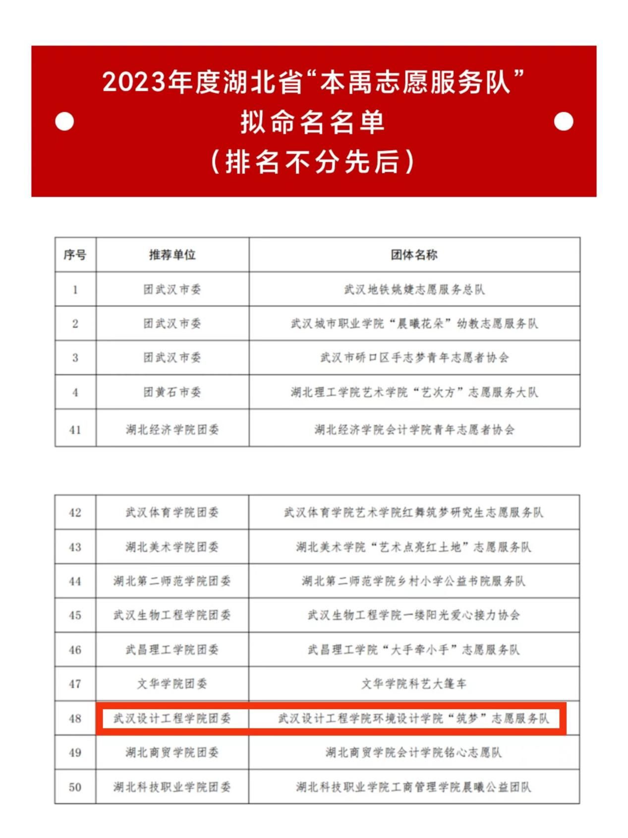 近日,2023年度湖北省“本禹志愿服务队”拟命名以及拟保留名单公示,拟命名2023年度湖北省“本禹志愿服务队”50支、2014-2022年度复核拟保留命名湖北省“本禹志愿服务队”150支。我们“筑梦”志愿服务队历经层层选拔,成功获评2023年度湖北省“本禹志愿服务队”。