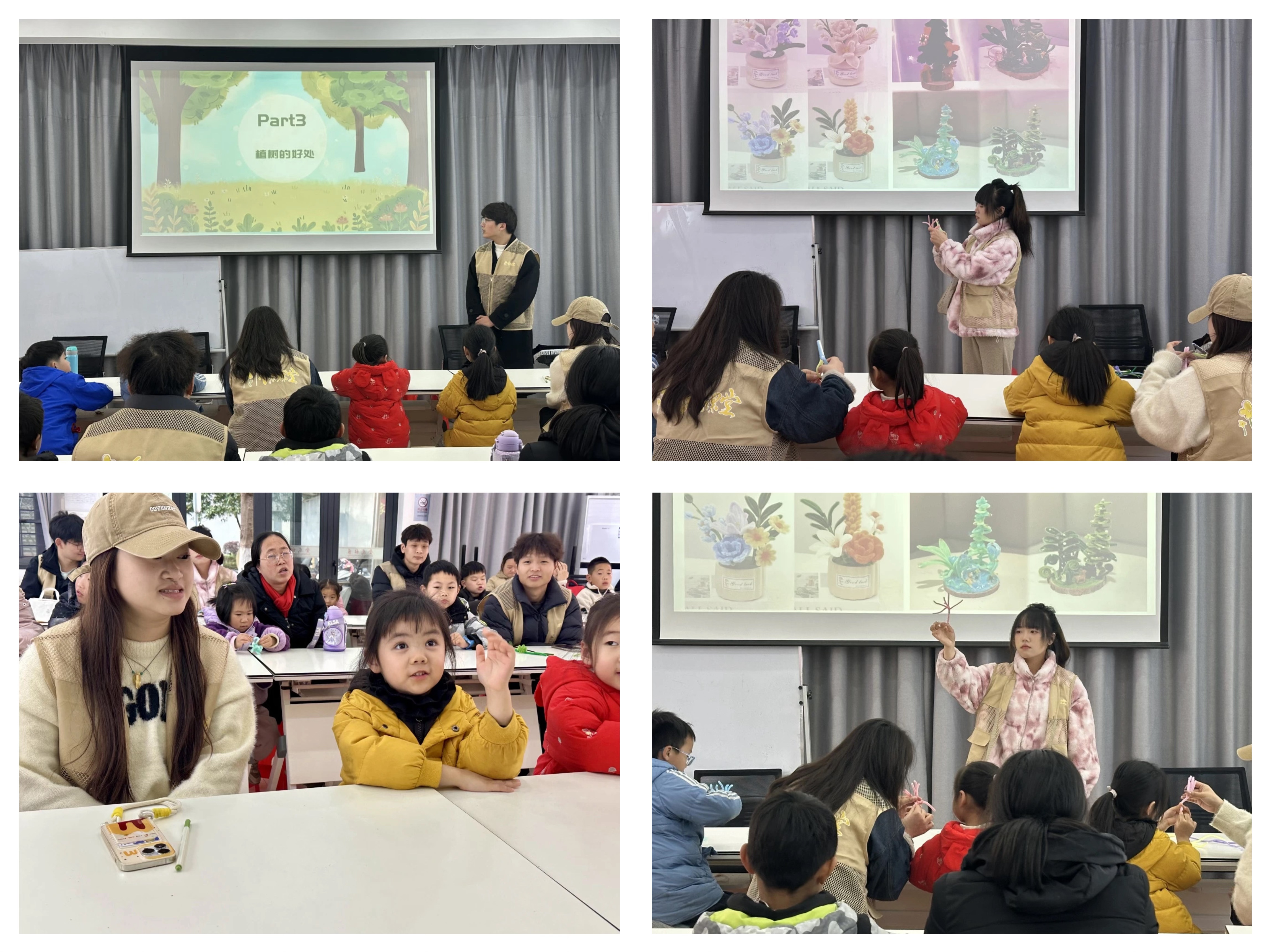 紧接着,活动的重头戏来了——制作扭扭棒植物微景观。志愿者们提前准备了五颜六色的扭扭棒、剪刀、胶水等材料,耐心地指导孩子们如何将这些简单的材料变成一片片栩栩如生的植物叶片。小朋友们发挥着自己的想象力,有的选择了清新的绿色,有的则大胆尝试了鲜艳的红色、黄色。他们小心翼翼地缠绕、修剪,每一片叶子都蕴含着孩子们对大自然的无限想象和热爱。