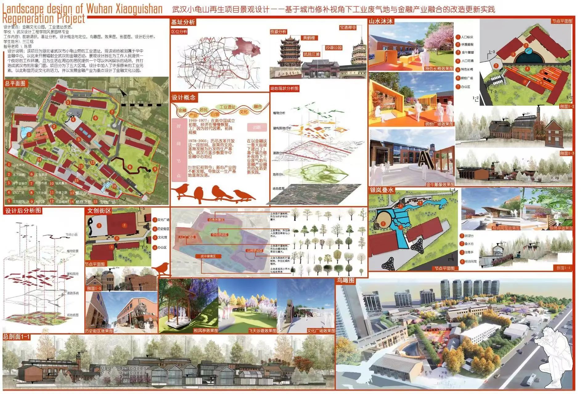 武汉小龟山再生项目场地的前身是湖北电建下的一座加工车间,经过历史的变迁,逐渐废弃。如今通过多方市场调研和精心策划,建设方从其所处武昌金融中心区位出发,拟引入金融相关企业,与原有的工业元素相融合,将其打造成一处公园式金融产业园区,即金融文化公园。其景观设计从金融文化公园的主要业态出发,遵循上位规划,充分结合使用人群的特点和需求,从城市修补视角下工业废弃地与金融产业融合的改造更新角度出发,对场地空间进行合理规划。打造“一干多枝”的格局,将公园分为一条历史发展轴和五个功能区,即入口广场区、中心活动区、公务休憩区、山间活动区、城中绿境区。以金融办公为焦点,围绕这一主体来打造一系列的配套设施。