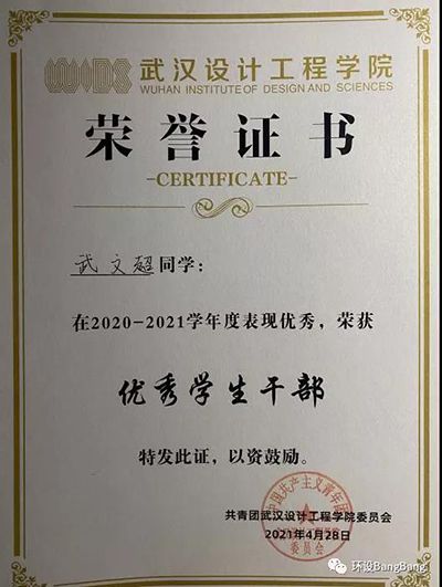 2021年4月武文超同学获“优秀学生干部”荣誉称号。