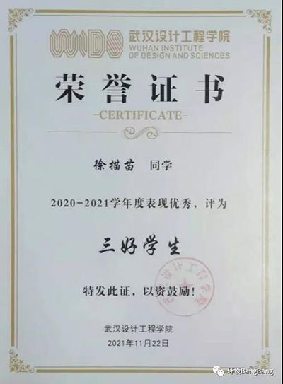 2020-2021学年度徐描苗同学获“三好学生”荣誉称号。