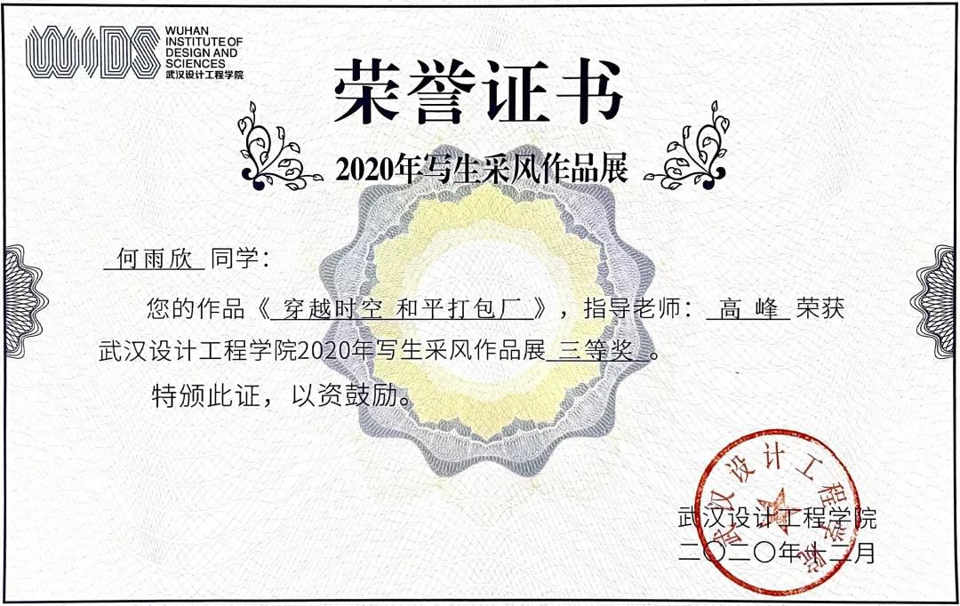 一分耕耘一分收获。何雨欣连续两年学习成绩与综测成绩班级排名双第一。她参加第27届湖北省翻译大赛获专业英语三等奖,她的作品《穿越时空 和平打包厂》获2020年写生采风作品展三等奖。