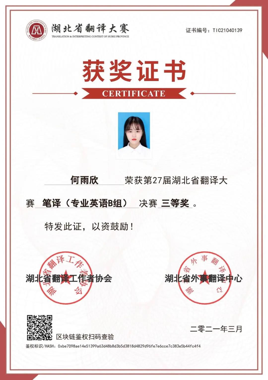何雨欣参加第27届湖北省翻译大赛获三等奖